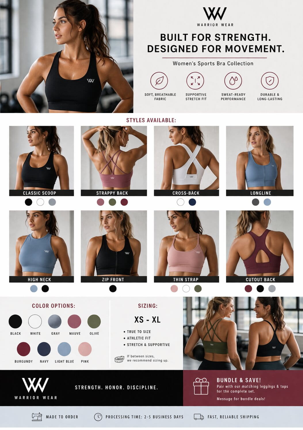 Elevate your training with the Warrior Wear Sports Bra Collection — designed for strength, comfort, and confidence.